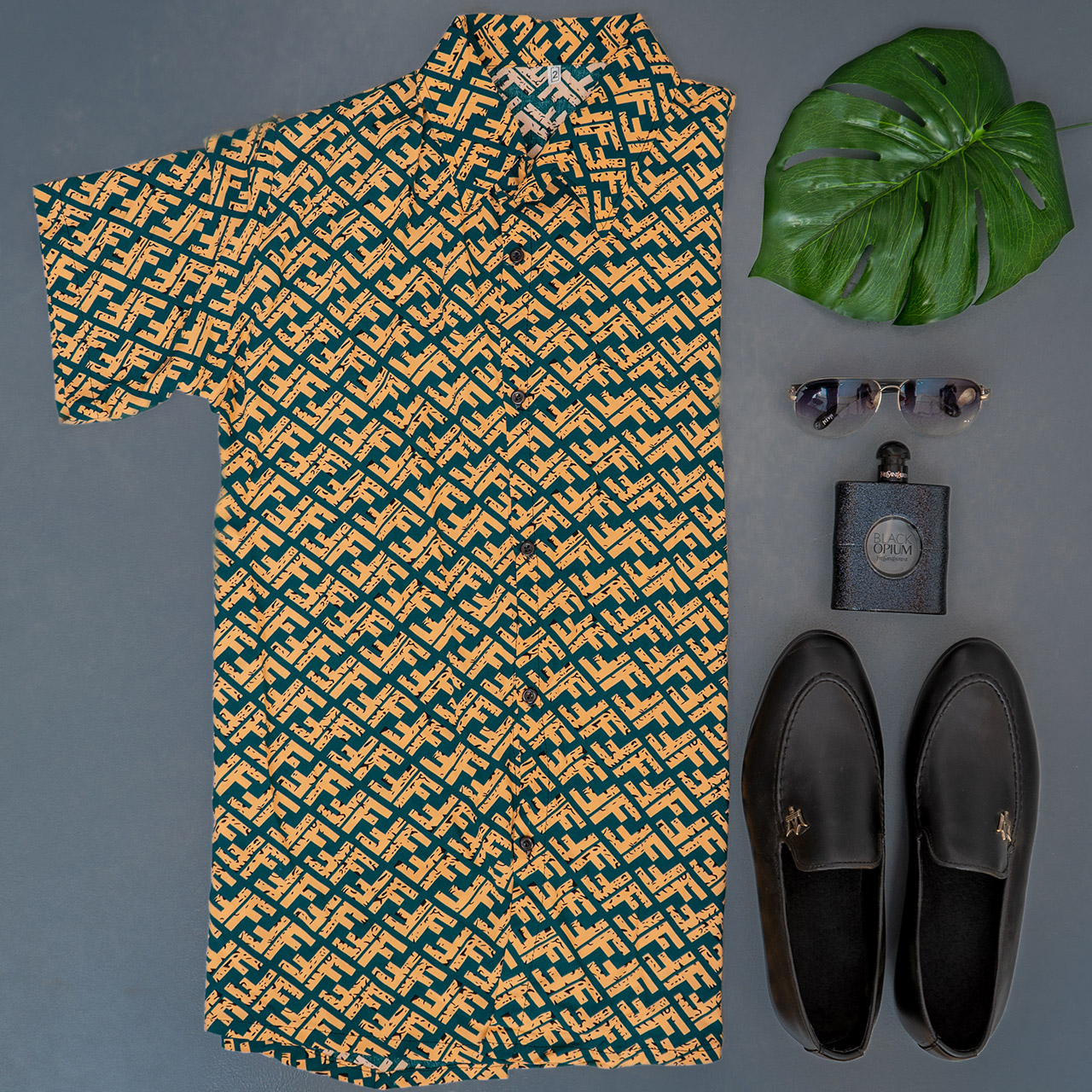 پیراهن هاوایی طرح فندی زرد مردانه مدل F82